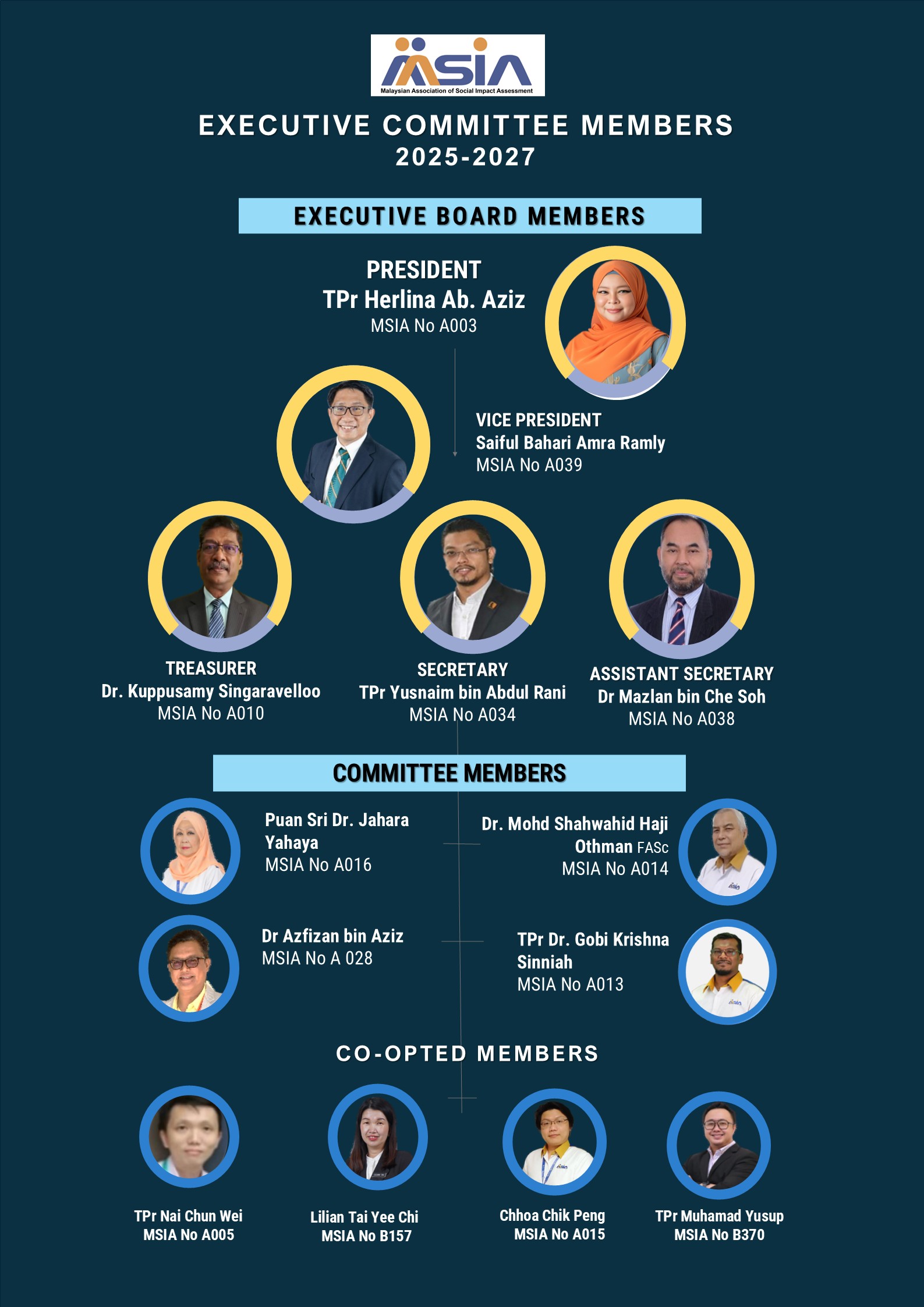 We are proud to present the newly elected Executive Committee members of the Malaysian Association of Social Impact Assessment (MSIA) for the term 2025–2027.