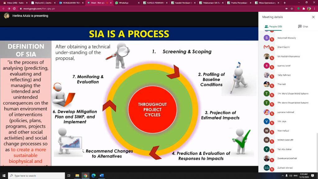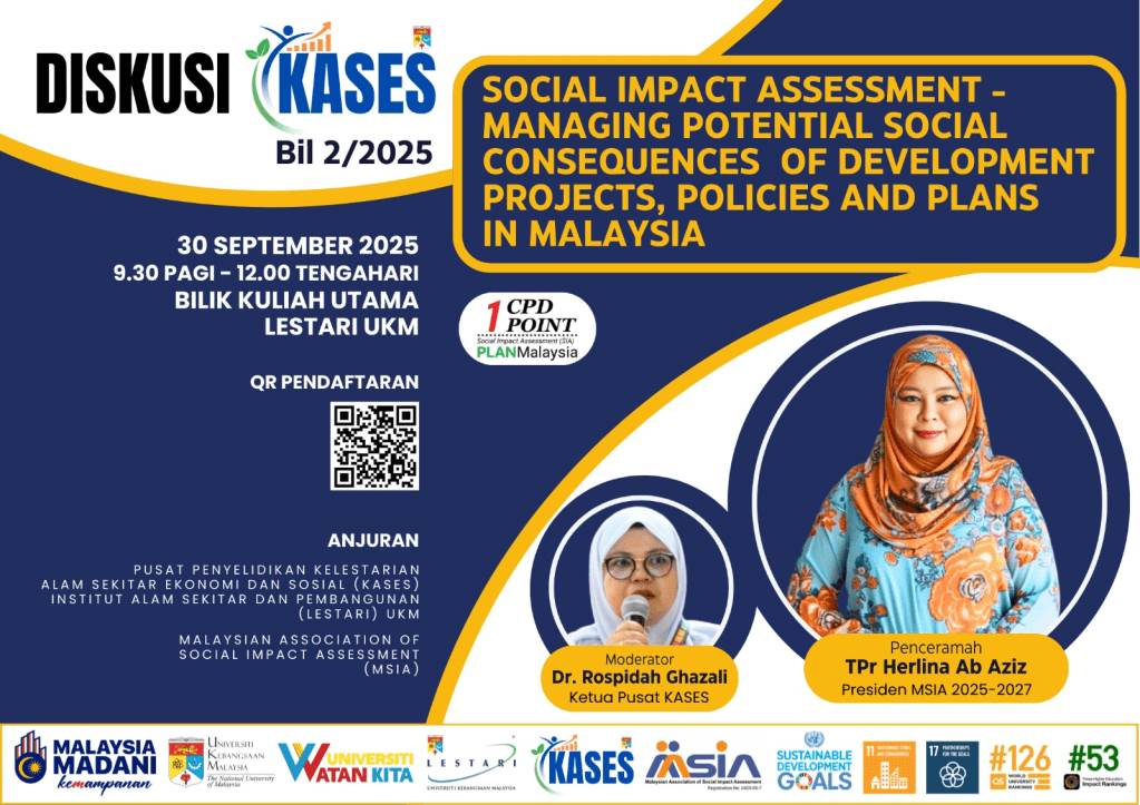 Social Impact Assessment (SIA): Managing Potential Social Consequences of Development Projects, Policies and Plans in Malaysia, by TPr Herlina Ab Aziz (A003) and moderated by Dr. Rospidah Ghazali, at LESTARI UKM, Selangor