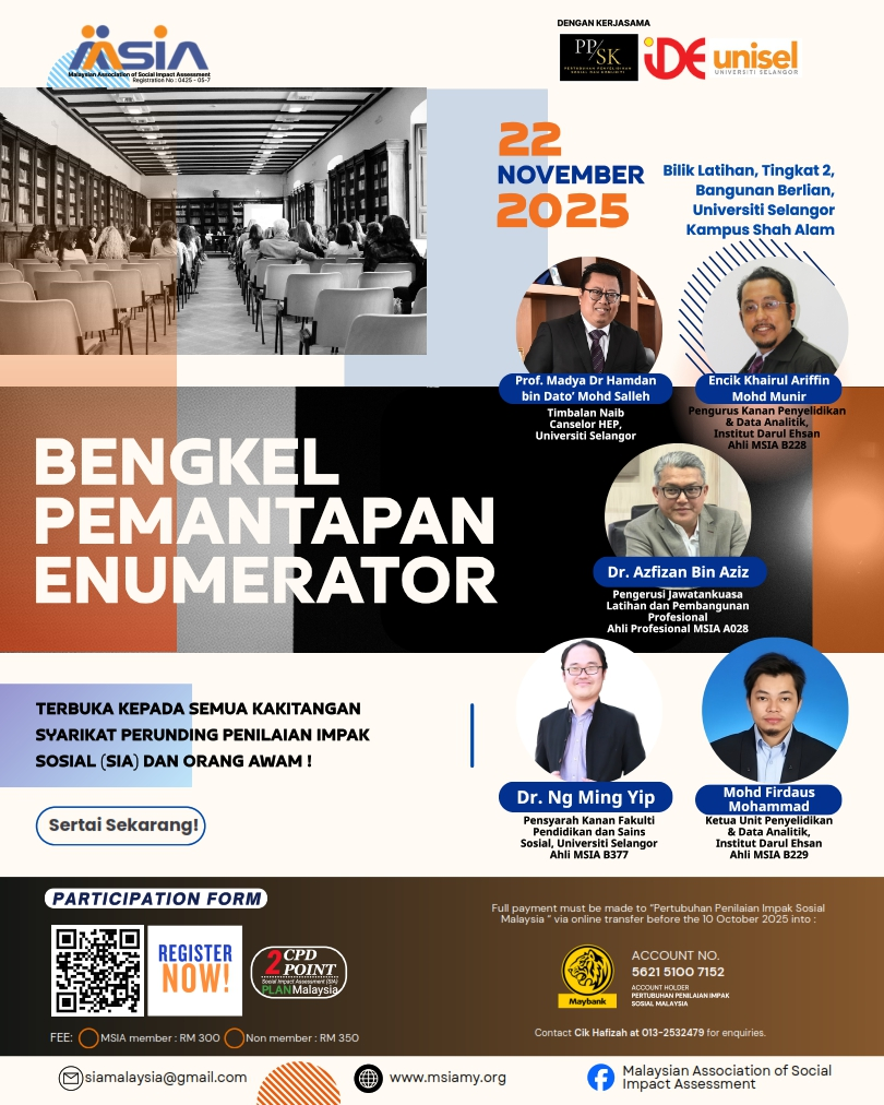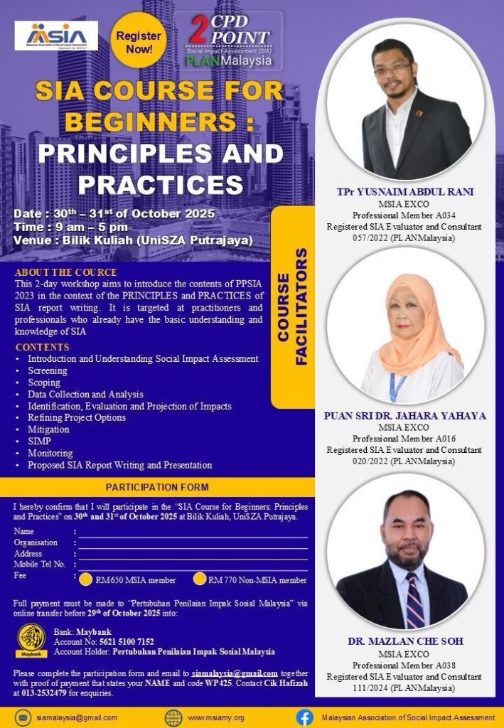 Professional Course on Best Practices in Social Impact Assessment (SIA) (Intermediate Level) by MSIA on 25 to 28 May 2024 at Bangi Resort Hotel, Bangi.