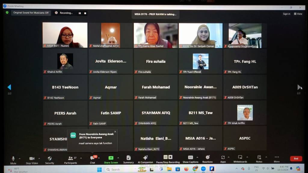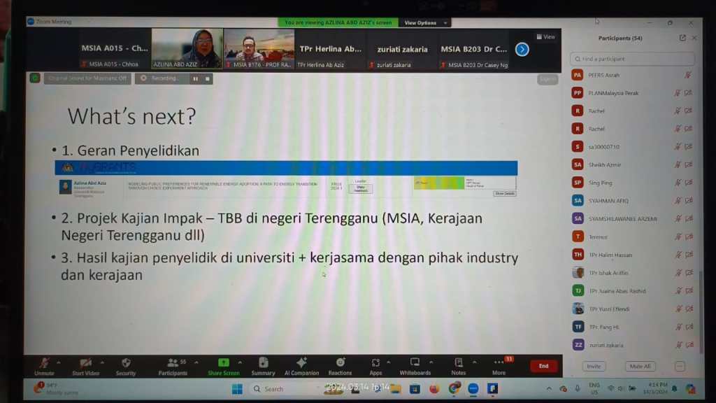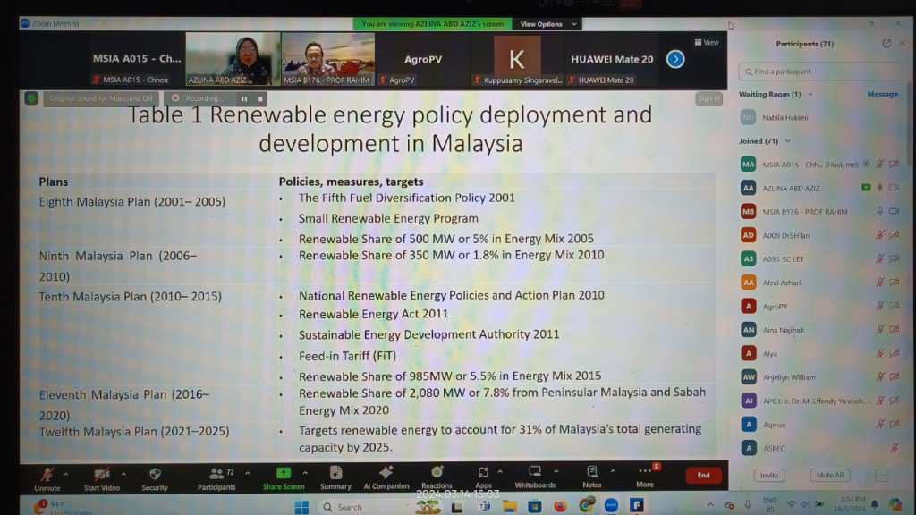 MSIA Talk – Projek Tenaga Boleh Baharu: Persepsi dan Impak kepada Masyarakat by Associate Prof Dr Azlina Abd Aziz, Faculty of Business, Economics and Social Development, Universiti Malaysia Terengganu. Moderator: Prof Dr Ab. Rahim Abdul Samad on 14 March 2024.