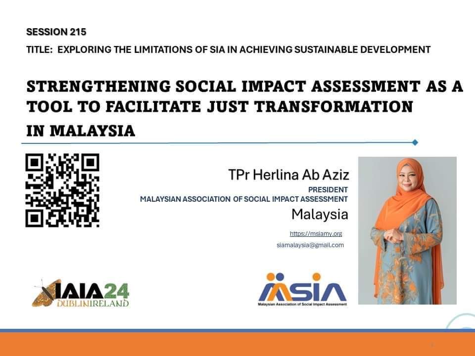 Mdm TPr President presented a paper entitled “Strengthening Social Impact Assessment asa Tool to Facilitate Just Transformation in Malaysia” in Session 215 ‘Exploring the Limitations of SIA in Achieving Sustainable Development’, IAIA24 Conference, Dublin, Ireland, on 25 April 2024