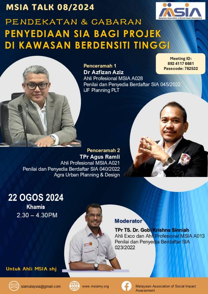 MSIA Talk 8/2024. ‘Pendekatan dan Cabaran Penyediaan SIA bagi Projek Berdensiti Tinggi‘, by Dr Azfizan Aziz (A021) and TPr Agus Ramli (A021), moderated by Dr TPr Gobi Krishna Sinniah (A013) on 22 August 2024