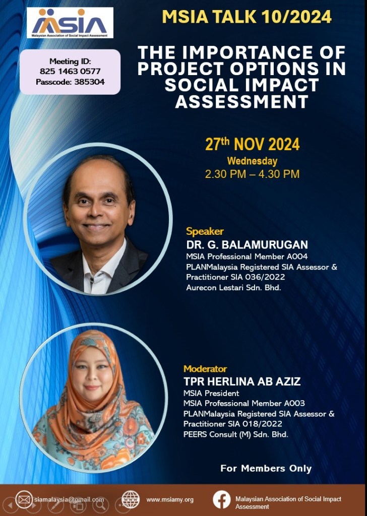 MSIA Talk 10/2024. ‘The Importance of Project Options in Social Impact Assessment‘, by Dr G. Balamurugan (A004), moderated by TPr Herlina Ab Aziz (A003) on 27 November 2024