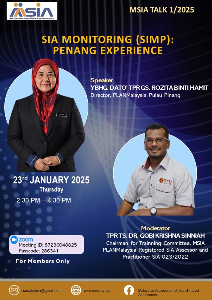 MSIA Talk 1/25. ‘SIA Monitoring (SIMP): Penang Experience’, by YBhg Dato’ TPr Gs. Rozita binti Hamit, Director of PLANMalaysia Pulau Pinang, moderated by TPr Ts Dr Gobi Krishna Sinniah (A013) on 23 January 2025