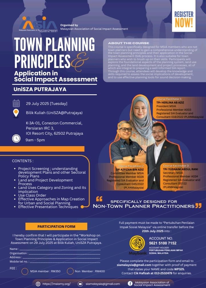 A one-day Social Impact Assessment workshop, specifically designed for non-town planners, will be held in Putrajaya on 29th July 2025.